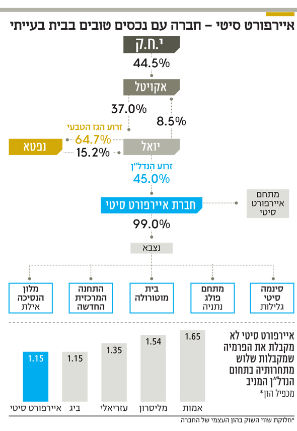 מתחם איירפורט סיטי רשום במאזני החברה בשווי של 2.188 מיליארד שקל, ותשואת ה־NOI שלו גבוהה במעט מ־10%. לכן נכס זה מתומחר בצורה שמרנית, וניתן לקבוע ששוויו האמיתי גבוה אף יותר. 57% משווי המתחם נובעים מתחום המשרדים, 34% מתחום האחסנה והתעשייה, שנהנה מהקרבה לנתב"ג, והשווי של ה־9% הנותרים נובע ממסחר, כנסים ואירועים. פעילות זו של החברה תלויה מאוד בתחום המשרדים, ששומר בשנים האחרונות על יציבות מבחינת המחיר והתפוסה, וזאת למרות עליית היצע המשרדים.