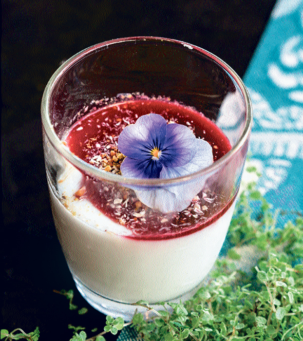 צילום: דניאל לילה וויסקי בר מוזיאון: פנקוטה קוקוס עם קולי מנגו וקוקוס, שטרויזל, שבבי מנגו פריכים, סלט קטן של מנגו, נענע, סורבה פסיפלורה ופרחי אמנון ותמר. 48 שקל, מתחם שרונה, תל אביב.