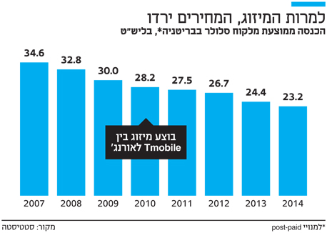 האם מיזוג חברות מבטיח עליית מחירים? ב־2010 אושר המיזוג בין אורנג' וטי מובייל בריטניה.שנתיים לאחר מכן החברה הממוזגת נרכשה בידי קבוצת BT, המקבילה המקומית לבזק, שהפכה למפעילת הסלולר הגדולה במדינה. ובכל זאת בחמש השנים שחלפו מאז המיזוג - ההכנסה הממוצעת למשתמש סלולר בבריטניה דווקא ירדה ב־17%. אלא שנראה כי הסיבה לירידת המחירים אינה קשורה למיזוג כלל.