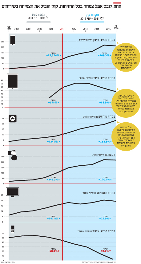 אבל מתחת לפרמטרים היבשים האלו מסתתרות מגמות בעייתיות שקוק התקשה להתמודד איתן. בשלוש השנים האחרונות נמצאות מכירות האייפד בירידה ובשנה האחרונה הן אף נמוכות משהיו בשנתו הראשונה של קוק בתפקיד.