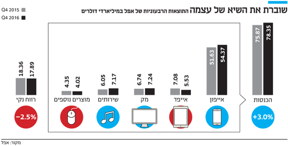 הדו"ח החיובי שחברת אפל פרסמה השבוע היה נחוץ לה כמו אוויר לנשימה. אחרי שלושה רבעונים היסטוריים רצופים של ירידה בהכנסות, אפל הצליחה לחזור למסלול צמיחה ברבעון הרביעי של 2016 (אוקטובר־דצמבר). ולא סתם לחזור, אלא לרשום את הרבעון הטוב בהיסטוריה של החברות הציבוריות (מחזיק השיא הקודם, רבעון דצמבר 2015 של אפל, הדיח מהמקום הראשון את רבעון דצמבר 2014 של החברה).