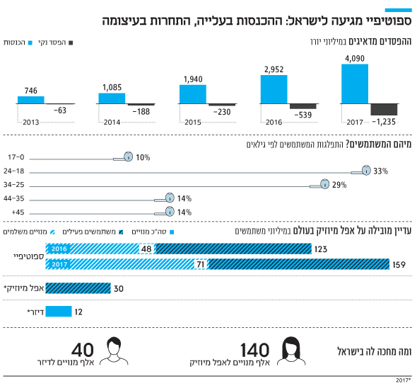 בעבור ספוטיפיי, יש חשיבות רבה להצלחה לחולל את השינוי הזה. בשבוע שעבר הגישה החברה את התשקיף שלה לקראת רישום ישיר בבורסת ניו יורק. התשקיף חשף שמצבה רחוק מלהיות מושלם. הכנסות החברה אמנם עולות בקצב מרשים – ב־2017 הן זינקו ב־38.6% ל־4.09 מיליארד יורו – אבל גם ההפסדים העמיקו ב־2017 ל־1.23 מיליארד דולר.