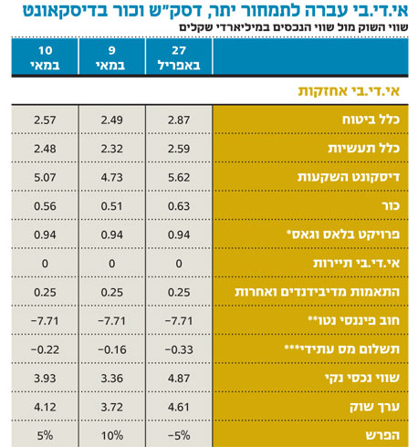 מתברר שהתגובה של מניית אי.די.בי אחזקות לתנודות החדות בשוק היתה מתונה מהשינוי בערך השווי הנכסי הנקי של המניה הנגזר מערך אחזקותיה (ראו טבלה). המניה עברה מדיסקאונט של 5% ערב הירידות בשוק לתמחור עודף של 10% בשיאן. בנעילה של 10 במאי התמתן תמחור היתר, אך עדיין נותר ברמה של 5%.
