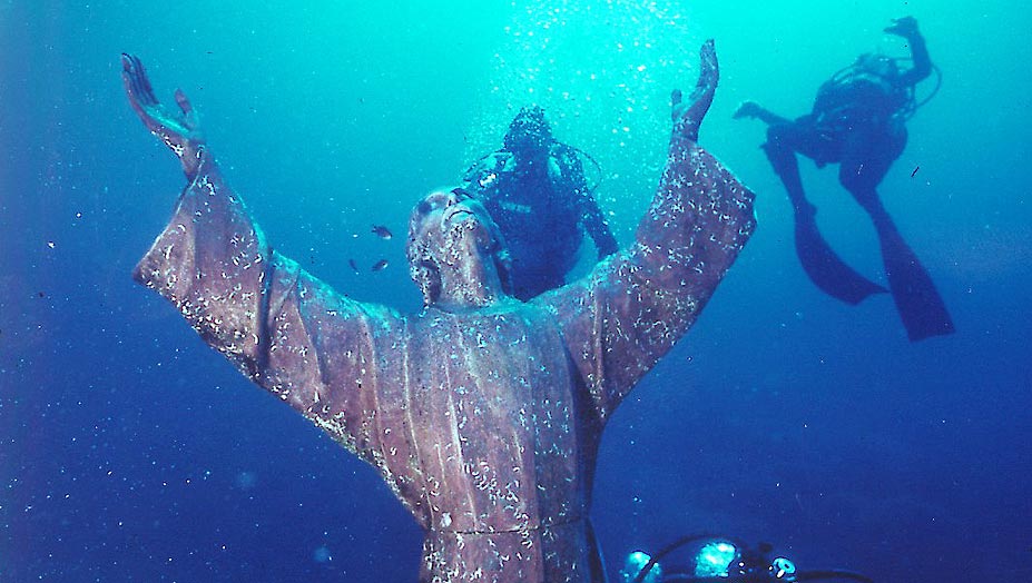 המשיח של התהום, מפרץ סן פרוטוסו, פורטופינו, איטליה. פסל הברונזה "המשיח של התהום", שיצק גווידו גלאטי ב-1954 ומתנוסס לגובה 2.7 מטרים, שוכן בעומק 15 מטרים לא הרחק ממנזר סן פרוטוסו שנבנה במאה ה-11. בימים שלווים, צוללנים ואף מטיילים על החוף (בסיוע משקפיים מיוחדים) יכולים להציץ על הפסל