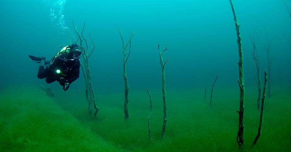 אגם Lygnstøylsvatnet, נורבגיה. ב-1908 מפולת חסמה את נהר ליגנה בעמק נורנגסדל התלול, בסמוך לאויה, ויצרה אגם באמצע ההר, ואתר מרכזי לצילומים תת ימיים. הצוללנים יכולים לחקור את השרידים של בקתות אלפיניות ולשחות מתחת גשר אבנים ששימש לחציית הנהר לפני שנשטף על ידו. האזור עשיר באצות וצמחייה ירוקה, אוסף של גזעי עצום כרותים מוכר בקרב המקומיים כיער הטרולים