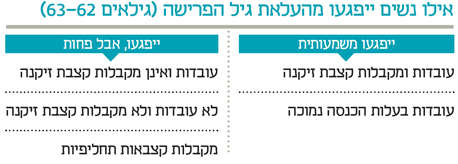 לפי נתוני סגנית הממונה על התקציבים יעל מבורך, שחברה בוועדה, רק 8% מהנשים בגילאים המבוגרים (62-32) צפויות להיפגע משמעותית מהעלאת גיל הפרישה. מדובר בנשים שכבר היום לא עובדות וחיות על קצבת הזקנה והשלמת הכנסה של הביטוח הלאומי. העלאת גיל הפרישה תרע משמעותית את מצבן משום שתגרום להן פשוט לחכות עוד כשנתיים עד לתחילת קבלת קצבת הזיקנה מהביטוח הלאומי.