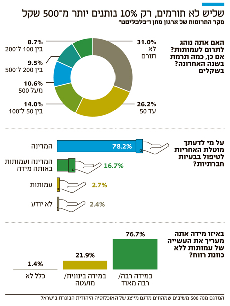 סקר של ארגון מתן ו"כלכליסט" מגלה כי רוב הישראלים לא תורמים כלל לגופים ללא כוונת רווח או מסתפקים בסכומים דלים של פחות מ־50 שקל בשנה. זאת אף ש־77% מהם מעריכים כי לפעילות העמותות יש השפעה חיובית. 78% מהציבור רואים את הבעיות החברתיות כאחריות בלעדית של המדינה, שיש לתקן אותן באמצעות כספי המסים שלנו