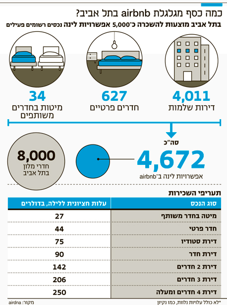 לפי דיווחי רשות המסים, הנושא נבדק בעיקר בערים הגדולות, ת"א, חיפה וירושלים, כאשר בת"א השוק הוא גדול משמעותית וממוסחר יותר משתי הערים האחרות - לפי נתוני האתר airdna, המנתח את הנתונים הגלויים של airbnb, בעיר רשומות כיום 4,762 אפשרויות לינה, מרביתן דירות שלמות והיתר חדרים או מיטות בחדר משותף.