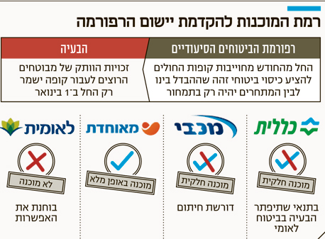 קופת החולים הגדולה בישראל, כללית, השיבה כי היא "ערוכה ליישום הרפורמה באופן מיידי, אלא שכלל לא בטוח שביטוח לאומי ערוך לכך, ואם המערכות של ביטוח לאומי אינן ערוכות, עלול להיגרם נזק למבוטחים".