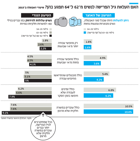 האוצר, שמעונייין להעלות את גיל הפרישה לנשים ל־64, פרסם סקירה שקובעת כי בנות 60 ומעלה מובטלות פחות מצעירות, מה שמרמז כי דחיית הפרישה לא תפגע בהן. אלא שאצל גברים המצב הפוך, ובני 62 ומעלה נאלצים להתפשר יותר על משרה חלקית