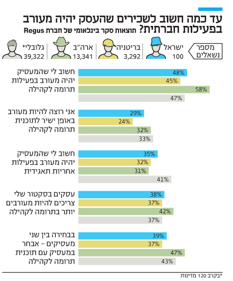 37% מהנשאלים הסכימו עם האמירה "עסקים בסקטור שלי צריכים להיות מעורבים יותר בתרומה לקהילה". בישראל עמד שיעורם על 38%, בברזיל 72%, ביפן 20% ובארצות הברית 42%.