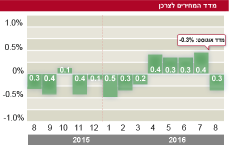 בחודשים האחרונים נראה היה שמדד המחירים לצרכן חוזר למגמת עלייה, כך שעם המדד החדש של אוגוסט מתחילת השנה עלו המחירים ב-0.1% וב-12 החודשים האחרונים ירדו ב-0.7%. המשמעות היא שבניגוד לציפיות, בשלב זה האינפלציה לשנה הנוכחית נראית כמתרחקת ולא מתקרבת ליעד שנקבע לבנק ישראל, שהוא אינפלציה של 1%-3%, ומכאן שקטנים הסיכויים, שהיו לא גבוהים גם כך, לעליית ריבית במשק.