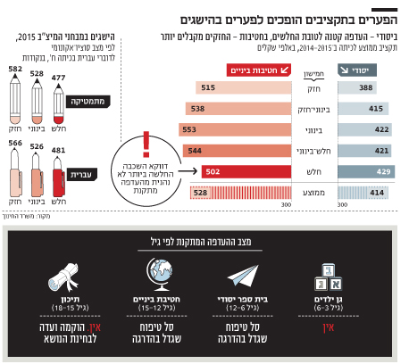מבחני המיצ"ב האחרונים (הכלי הישראלי למדידת יעילות וצמיחה בית ספרית) שפורסמו היו ב־2014–2015. התוצאות מצביעות על כך שלא רק שיש פערים גדולים ומשמעותיים, אלא שגם בשום תחום כמעט הם לא צומצמו בהשוואה למבחנים הקודמים, ולעיתים הם גדלו. הפער במבחני העברית לכיתה ח', באוכלוסייה היהודית, עומד על 85 נקודות בין השכבות החזקות לחלשות, והפער במתמטיקה לכיתה ח' על 105 נקודות. והאמת היא שאלה פערים קטנים בהרבה מהמציאות, כיוון שהתוצאות מפרידות בין יהודים וערבים, והמגזר הערבי מהווה חלק גדול מהשכבות החלשות בישראל.