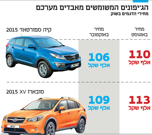 סובארו XV, רכב הארבע על ארבע הנמכר ביותר בישראל, ירד גם הוא בשיעור דומה. כך, בעוד שסובארו XV מודל 2015 בעלת מנוע בנפח 1.6 ליטרים עלתה באוגוסט 113 אלף שקל, מחירה בספטמבר ירד באלף שקל. באוקטובר ספגה הסובארו ירידת ערך של אלף שקל נוספים — ואילו באוקטובר ירד מחירה ל־109 אלף שקל. תנודות דומות תועדו בכל רכבי הכביש־שטח הפופולריים.