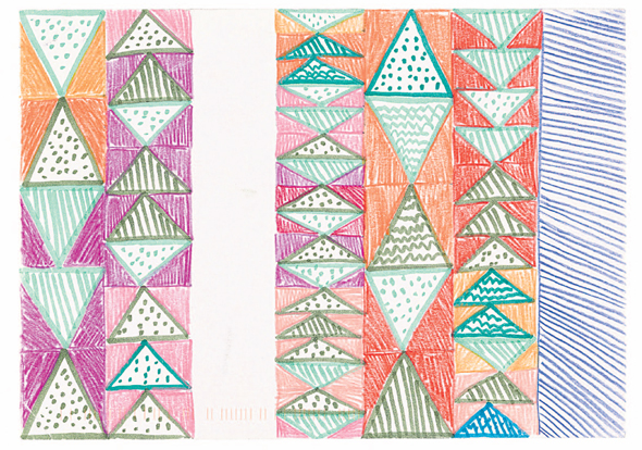 "שבוע החיוך לזרים": כל טור מסמל יום, והחיוכים מצוירים בו כמשולשים, בסדר כרונולוגי. הצבע סביב המשולש מסמל את מיקום החיוך (בבית, ברחוב וכו'). הטקסטורה בתוך המשולש מסמלת את מושא החיוך (גבר, אשה, ילדים). צבע המשולש מסמל את התגובה (חייכו בחזרה, לא חייכו בחזרה, לא שמו לב שחייכתי)