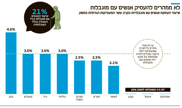 שיעור העסקת אנשים עם מוגבלות משקף עד כמה הרגולציה רחוקה מהנעשה בשטח. לפני חודשיים נכנס לתוקפו צו ההרחבה לעידוד והגברת תעסוקה של אנשים עם מוגבלויות, שלפיו כל חברה שמעסיקה יותר ממאה עובדים מחויבת לדאוג שלפחות 3% מעובדיה יהיו אנשים עם מוגבלות. הצו נחתם כבר ב־2014 על ידי שר הכלכלה דאז נפתלי בנט, כך שלמעסיקים היה זמן להיערך לחובה החדשה, אולם בבדיקת "כלכליסט" לכתבה הראשונה בסדרה שתעסוק בנושא העסקת אנשים עם מוגבלות — התברר כי החברות הגדולות מאוד לא בדיוק ממהרות למלא אחר הצו, ומתכחשות לחובתן לפעול לשילוב האוכלוסייה המוחלשת.