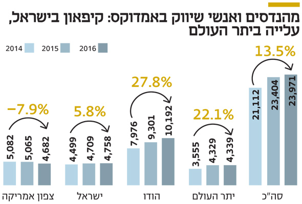 החברה, המציעה שירותים למערכות חיוב לקוחות, פרסמה בשבוע שעבר את הדו"חות הכספיים המלאים לשנת הכספים הפיסקאלית 2016 (20F). התוצאות הכספיות פורסמו בנובמבר, אבל כעת חשפה אמדוקס את מצבת כוח האדם שלה. מצבת עובדיה בעולם צמחה ב־13.5% בשנתיים, מ־22,500 עובדים ב־2014 ל־25,500 ב־2016. הצמיחה החדה במספר העובדים נרשמה בשנה החולפת — עלייה של 22% ל־1,590.