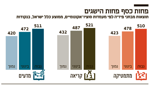 אגב, בלי קשר לפערים, תוצאות הבחינות מעמידות את ממוצע הציונים של תלמידי ישראל במקום נמוך מממוצע ה־OECD בכל שלושת תחומי האוריינות הנבדקים (מדעים, קריאה ומתמטיקה).