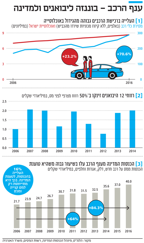 אלא שבכך מתכוונת המדינה רק להכנסות ממס קנייה וממכס על רכבים. מעיון בנתוני רשות המסים ומינהל הכנסות המדינה עולה כי הכנסות המדינה מענף הרכב (מס על רכב חדש, מס על דלק, אגרות וחלפים) בתקופה הזו עלו ב־64%, מ־21.7 מיליארד שקל ב־2006 ל־35.6 מיליארד שקל ב־2014.