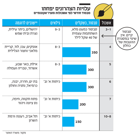 הסבסוד לילד ברשות מקומית מאשכול 4 יהיה 350 שקל בחודש, באשכול 5־6 יינתן סבסוד של 300 שקל בחודש, באשכול 7 יינתן סכום של 200 שקל בחודש ובאשכולות 8‑10 הסבסוד יעמוד על 150 שקל בחודש.