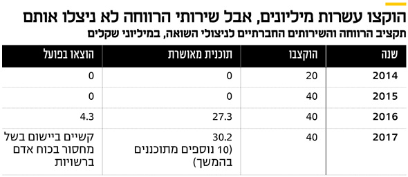 משרד הרווחה לא השלים בעוד מועד את גיבושה של תוכנית הסיוע ולא הביאה לאישור האוצר, ולכן לא נוצל התקציב כלל בשנים 2014 ו-2015. בשנת 2016 אושרה תוכנית בהיקף של 27.3 מיליון שקל בלבד מתוך ה-40. בפועל נוצלו רק 4.3 מיליון.