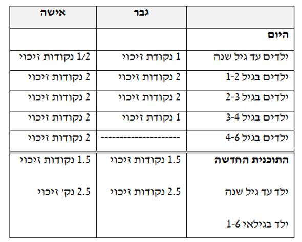 לפיכך, אם ילד נולד למשל בחודש יוני, שני הוריו העובדים ייהנו מ-3 נקודות זיכוי ב-2017, ובין השנים 2018 עד סוף 2022 הם ייהנו מ-5 נקודות זיכוי.
