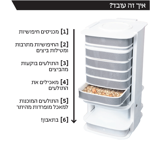 "כל כוורת שאנחנו מוכרים מגיעה בלוויית ערכה התחלתית עם חיפושיות חיות שמוכנסות למגירה העליונה, שבה הן מתרבות ומטילות ביצים. משם הן עוברות אוטומטית למגירות התחתונות, שבהן בוקעות התולעים. בכל אחת מהמגירות יהיו תולעים בשלב אחר של חייהן לפי סדר המוכנות שלהן לקציר. באמצעות כפתור מפעילים אחת לשבוע את פעולת הקציר, אז מופרדות התולעים ה'מוכנות' מאלה שעדיין לא ומשאריות המזון שבהן מאכילים אותן. כך ניתן לקצור אותן באופן נקי ומסודר. כל מגירה מכילה כ־400 גרם של תולעים שמספיקות לצריכה של כשבועיים, אם משתמשים בהן לשלוש־ארבע ארוחות בשבוע".