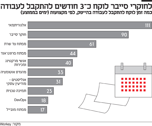 בישראל, בתעשיית ההייטק העובדים שתהליך הגיוס שלהם הוא הקצר ביותר – 17 יום בממוצע - הם מפתחי מובייל וזאת מכיוון שמדובר במקצוע שלא דורש הרבה הכשרה, כך לפי נתונים שאסף הסטארטאפ workey לחיפוש עבודה בהייטק עבור 'כלכליסט'. כמו כן, הביקוש הוא בדרך כלל גבוה ועל כן חברות מתפשרות על רמת ההנדסה, מסבירה תמרה הומן מזרחי, מנהלת Sales & Account Management ב-Workey. גם תחום ה-DevOps מתאפיין בגיוס מהיר (18 יום בממוצע) וזאת מכיוון שמדובר במקצוע קריטי לחברה שבו קשה למצוא מועמדים איכותיים בשוק. "אם החברה המגייסת נתקלת במישהו איכותי – היא 'חוטפת' אותו", אומרת הומן מזרחי.