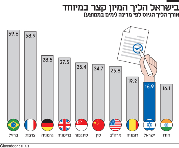 תהליך הגיוס של עובדים בישראל, הזמן שעובר מרגע שמתקבלים קורות החיים בחברה ועד שהמועמד מקבל הצעת עבודה, הוא בין הקצרים בעולם – 16.9 ימים בממוצע, כך לפי מחקר של אתר ההשמה גלאסדור.