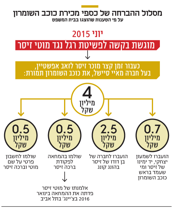 האם איש העסקים המנוח מוטי זיסר מכר את חברת כוכב השומרון, שהיתה בבעלותו, זמן קצר לאחר שנקלע להליכי פשיטת רגל, בניסיון להבריח נכסים? ומדוע שולם חלק מהתמורה על החברה בהמחאה לרעייתו, ברכה זיסר, שפדתה אותה מאוחר יותר אצל חלפן כספים (צ'יינג') בתל אביב?