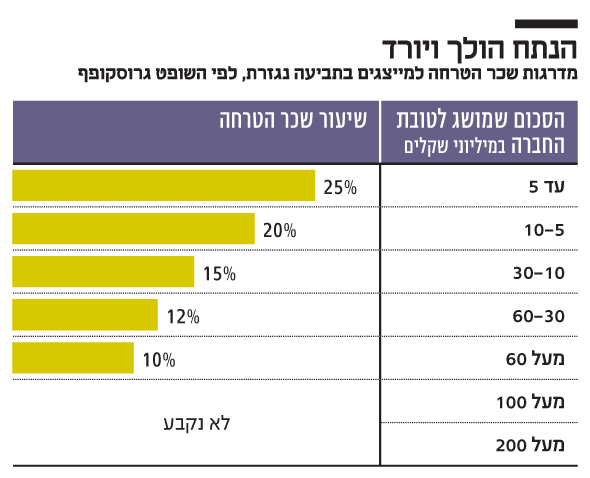 בתיק דסק”ש גרוסקופף שכלל את המדרג וקבע שיעורים גם לסכומים הגבוהים מ־16 מיליון שקל. הוא קבע כי 15% ישולמו עד תקרה של 30 מיליון שקל, ואם התיק מסתיים בפיצוי של עד 60 מיליון שקל שכר הטרחה המקסימלי יעמוד על 12%. מעל סכום זה השיעור הוא 10%.