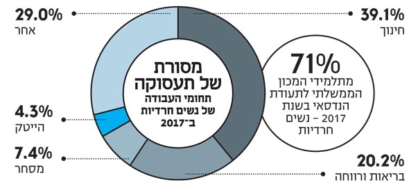 למרות המיתוס סביב השתלבות נשים חרדיות בהייטק והמאמץ הממסדי הגדול המופנה לכיוון זה, רק 4.3% מהנשים החרדיות, שהן 5,800 נשים, מועסקות בהייטק. זאת, לעומת 59% מההחרדיות המועסקות בתחומי החינוך, הבריאות, הרווחה והסיעוד.