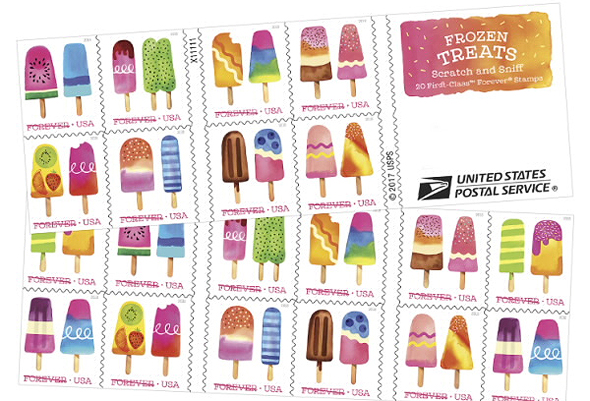 גם שירות הדואר האמריקאי מתכונן לקיץ, ומנפיק בפעם הראשונה בתולדותיו בולים ריחניים. סדרת הבולים החדשה,"Frozen Treats", מוקדשת לקרטיבים פירותיים בשלל צבעים מסחררים. הבולים מצופים במעטה מיוחד, ולאחר גירוד קל הם מפיצים ניחוח משכר של פירות וקיץ. מסוף יוני, 10 דולרים.