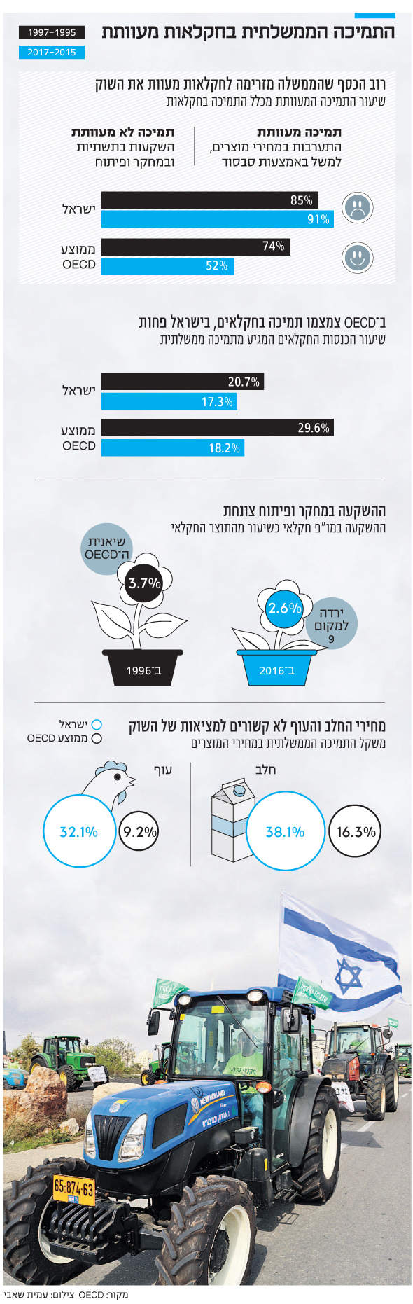הפערים מול שאר מדינות הארגון בתחום זה הם דרמטיים. בממוצע, במדינות ה־OECD רק כ־16% מהכנסות החקלאים מחלב מגיעות מתמיכה ממשלתית, לעומת כ־38% בישראל. במקרה של העופות המצב של הצרכן הישראלי עוד יותר גרוע: התמיכה מגיעה ליותר מ־32%, לעומת 9% בממוצע במדינות ה־OECD - יותר מפי שלושה.