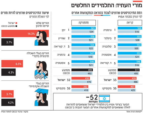 מחקר חדש של ה־OECD מעמיד בספק את הסיכוי לשפר את רמת ההוראה בישראל בשנים הקרובות. לפי המחקר, רמת תלמידי התיכון הישראלים ששואפים להיות מורים היא מהנמוכות בארגון על פי הישגיהם במבחני PISA. הציונים שקיבלו מורי העתיד של ישראל בקריאה נמצאו במקום השלישי מהסוף, ובמתמטיקה ‑ במקום הרביעי מהסוף.