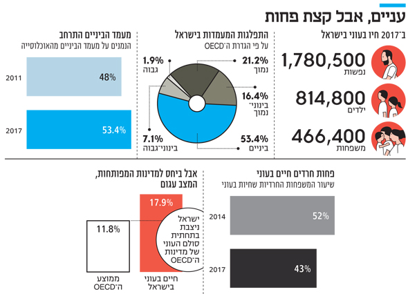 לפי דו"ח העוני ל־2017, שיעור הישראלים שמשתייכים למעמד הביניים עלה ל־53%. אלא שישראל עדיין משתרכת הרחק מאחורי הממוצע של ה־OECD, והטכנולוגיות שמחליפות עובדים חסרי השכלה מאיימות על המשך המגמה ועל היציבות הכלכלית של ישראל