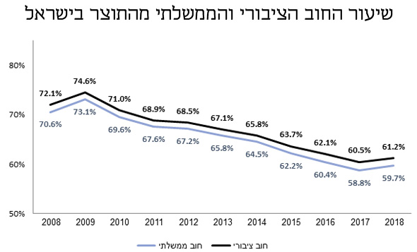 החשב הכללי במשרד האוצר, רוני חזקיהו, פרסם היום (ד') אומדן ראשון לשיעור החוב הציבורי והממשלתי מהתוצר לשנת 2018 ממנו עולה כי היחס בין החוב לתוצר עלה משיעור של 60.5% ל-61.2%. מדובר בבלימת המגמה של הפחתת היחס בין החוב לתוצר מאז 2009. מאז ירד במצטבר היחס ב-11%.