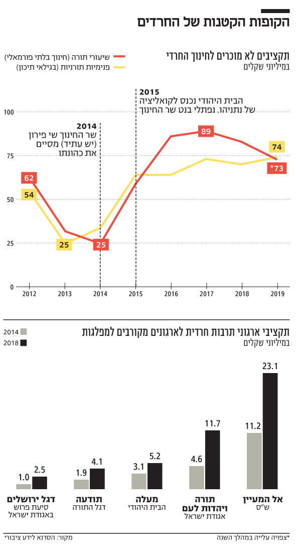 בהסכם הקואליציוני של יהדות התורה מ־2015 נכתב: "תקציב תרבות חרדית במשרד החינוך ותקציב מוסדות ציבור במשרד הרווחה ישוב לגודלו של תקציב 2012". מפלגת יש עתיד ששלטה ב־2013‑2015 בשני המשרדים שבהם מחולקים התקציבים האלה וכן באוצר קיצצה אותם משמעותית. אך הם קמו לתחייה בקדנציה הנוכחית ואף שברו שיאים.