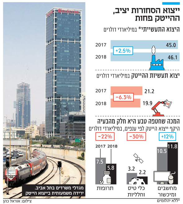 בסוף השבוע האחרון פרסמה הלשכה המרכזית לסטטיסטיקה את מאזן הייבוא והייצוא של סחורות לשנת 2018. הדו"ח מחלק את כלל הסחורות לפי מדרג טכנולוגי: מתעשייה מסורתית ועד תעשיית הייטק. מהמסמך עולה כי דווקא בשנה שבמהלכה חגג הדרג הפוליטי את חציית ה־100 מיליארד דולר בייצוא שירותים, נרשמה צניחה בייצוא סחורות של תעשיית ההייטק, והוא ירד בכ־6.3% לרמה של 19.9 מיליארד דולר – רמה דומה לזו שנרשמה ב־2014, לפני ארבע שנים. הנתון מטריד במיוחד נוכח העובדה כי כלל הייצוא התעשייתי דווקא המשיך לצמוח בקצב של 2.5% לרמה של 46.1 מיליארד שקל. למעשה בכלל מגזרי התעשייה -התעשייה המסורתית, המעורבת מסורתית והמעורבת עלית - נרשם גידול בייצוא הסחורות, מלבד מגזר ההייטק.