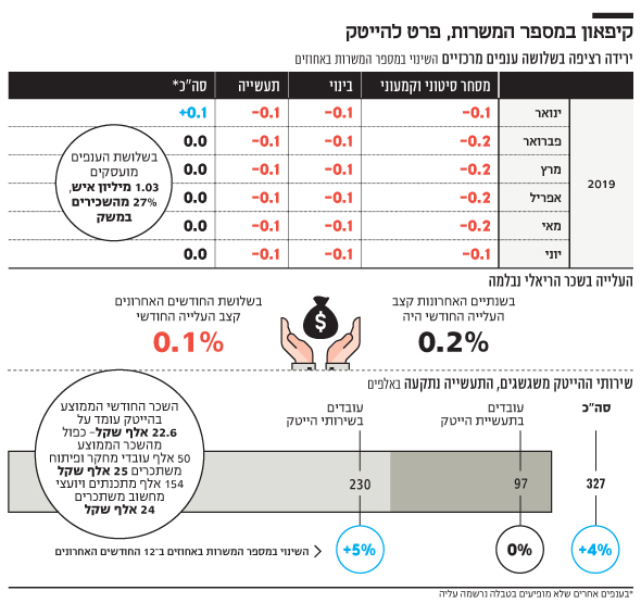 העלייה במספר המשרות במשק שאפיינה את השנים האחרונות נעצרה: לפי נתוני מגמה של מספר המשרות במשק בין החודשים ינואר-יוני, שאותם פרסמה אתמול הלמ"ס, ינואר 2019 היה החודש האחרון בו נרשמה עלייה במספר המשרות (אם כי של 0.1% בלבד) ומאז הכל נעצר. שיעור העלייה בחמשת החודשים הבאים (פברואר־יוני) הסתכם ב־0%.