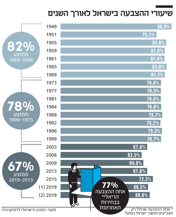 הקושי בהנעת הלא־מצביעים מתחדד כשבוחנים את שיעור ההצבעה האמיתי בישראל. אפשר לחלק את תולדותיו לשלוש תקופות. ב־20 השנים הראשונות ועד בחירות 1969 עמדו שעורי ההצבעה על יותר מ־80% עם שיא של 87% בבחירות הראשונות ב־1949. החל מבחירות 1973 נרשמה צניחה למתחם שבין 75% ל־80% וזה נמשך עד בחירות 1999 שבהן נבחר מנהיג העבודה אהוד ברק לראשות הממשלה בשיטת הבחירה הישירה.