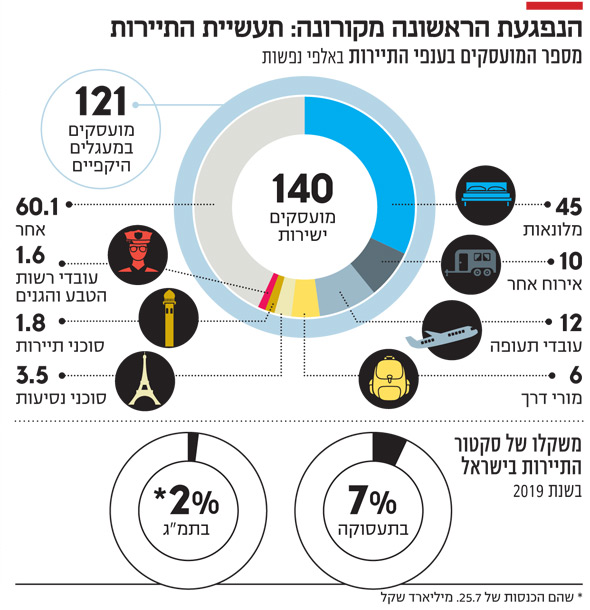 מי שכבר ספג מכה אנושה, הוא ענף התעופה והתיירות. זאת אחרי שהתיירות הנכנסת מאסיה וממדינות כמו איטליה נעצרה כליל, והיד עוד נטויה. לפי נתוני הלשכה המרכזית לסטטיסטיקה מהשבוע שעבר, סקטור התיירות רשם הכנסות של 25.7 מיליארד שקל (7.56 מיליארד דולר), שהם כ־2% תמ"ג, בשנת 2019. לפי נתונים של משרד התיירות, משקלו של סקטור התיירות בתעסוקה משמעותי יותר: מדובר בכ־7% מכלל המועסקים במשק. מהם כ־140 אלף מועסקים באופן ישיר ועוד 121 אלף מועסקים במעגלים היקפיים - בסך הכל כ־260 אלף עובדים.