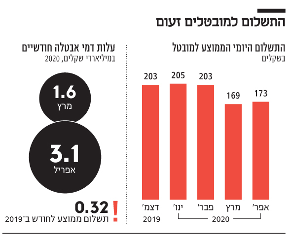 בחודש אפריל שילם ביטוח לאומי 3.1 מיליארד שקל ל־890 אלף מובטלים - שהם 3,500 שקל למובטל בממוצע. הסכום הנמוך מעיד על כך שמרבית מובטלי הקורונה מגיעים מהשכבות החלשות ביותר ובעלי שכר נמוך
