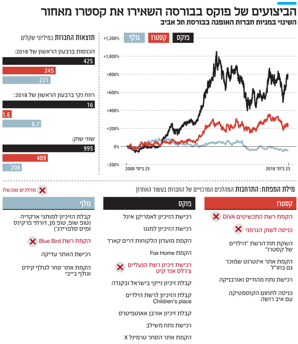 מנגד, המתחרה הגדולה של קסטרו - קבוצת פוקס - התעצמה והתרחבה, בעיקר באמצעות קבלת זיכיונות למותגים בינלאומיים, ביניהם נייקי, פוט לוקר, מנגו, אורבן אאוטפיטרס, אמריקן איגל ועוד. כמו כן באמצעות כניסה לשותפות במותגי אופנה ישראליים קטנים והקמת אתר סוחר בקונספט של קניון וירטואלי, בשם טרמינל X, שמוכר לא רק את מותגי הקבוצה, אלא גם עשרות מותגים בינלאומיים אחרים. בנוסף, בימים אלו פוקס מנהלת מגעים לקבלת זיכיון לפתיחת חנויות של מותגי קבוצת הקוסמטיקה אסתי לאודר שמוצריה נמכרים כיום בטרמינל X.