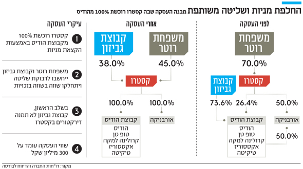 לאחר ביצוע הקצאת המניות, משפחת רוטר בעלת השליטה בקסטרו, תרד מאחזקה של 70% בחברת האופנה ל־45% ובעלי הודיס - קבוצה בראשות יוסי גביזון - תחזיק ב־38% מהחברה. משפחת רוטר וקבוצת גביזון ייחשבו לדבוקת שליטה וייתחלקו בזכויות, אך בשלב הראשון קבוצת גביזון לא תמנה דירקטורים בקסטרו. סמנכ"ל הכספים של קסטרו ובנם של בעלי השליטה רון רוטר, אמר אתמול בשיחה עם "כלכליסט", כי "מבחינתנו מדובר על שותפות של חצי־חצי. לקבוצת הודיס היתה אפשרות למנות שלושה דירקטורים בקסטרו במסגרת העסקה אבל הם בחרו שלא למנות אותם. יש להם כמובן זכות לעשות את זה בכל רגע, ומבחינתנו אין עם זה בעיה. זה מצביע על שותפות".