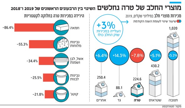 אך אובדן נתח השוק הוא רק חלק מהסיפור. מהנתונים שהגיעו לידי "כלכליסט" עולה כי מכירות טרה נפלו ב־7.8% בשלושת החודשים הראשונים של השנה לעומת התקופה המקבילה. נתון זה מסמן אובדן מכירות של 19.2 מיליון שקל, חרף העלאת מחירי מוצרי החלב הלא מפוקחים במהלך הקיץ.