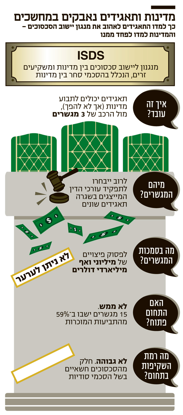 זה יותר מ־80 שנה שמיליארדי דולרים עוברים כך, בצללים, מכיסי משלמי המסים לתאגידים בינלאומיים. הנה כמה דוגמאות: אקוודור חויבה לשלם 1.7 מיליארד דולר לחברת הנפט אוקסידנטל פטרוליום, אחרי שביטלה את זכויות הקידוח שלה באמזונס בגלל הפרת הסכמים מצדה של אוקסידנטל; ענקית הפארמה באייר תבעה את הודו בגלל שהתירה להפיץ גרסה גנרית לתרופה יקרה שלה לסרטן. באייר הפסידה בתביעה, אבל מסתבר שבהסכם חשאי, שדלף לאחרונה, הודו הבטיחה לארה"ב שזה לא יקרה שוב. ומול גרמניה תלויה ועומדת היום תביעה של 6 מיליארד דולר על החלטה להפסיק להשתמש באנרגיה גרעינית.