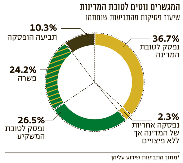 ישראל, ככל הידוע, מעולם לא עמדה בפני תביעה כזאת. אבל יש קולות שמזהירים מפני אפשרות כזאת, אפילו מלב הממסד. רק לפני שנה הזהיר המשנה ליועמ"ש דאז אבי ליכט כי ישראל חשופה לתביעת ענק מצד נובל אנרג'י אם מתווה הגז יפגע בזכויותיה. נובל, כזכור, רשמה את פעילותה במאגרי הגז המקומיים בחברה־בת שהקימה בקפריסין, שמולה חתומה ישראל על הסכם דו־צדדי.