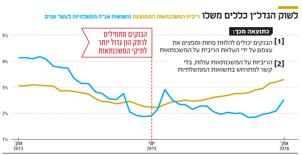 בין אוקטובר 2013 ליוני 2015 היה קשר חזק מאוד (מתאם של 0.94) בין תשואות האג"ח הממשלתיות לעשר שנים לגובה הריבית על המשכנתא. לעומת זאת, מאז יולי 2015 ועד נובמבר 2016 המתאם הפוך ועומד על 0.25-.