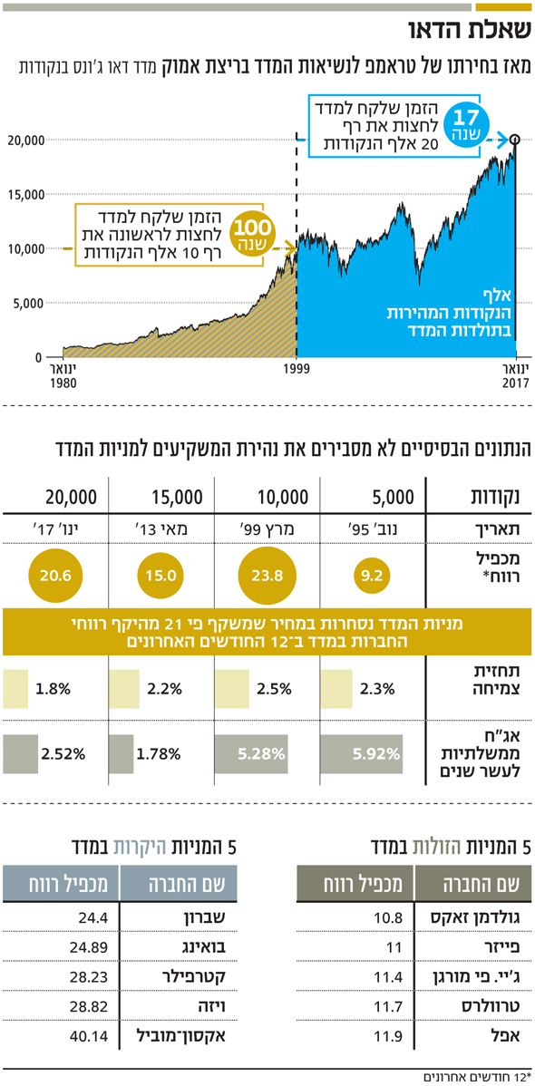 מדד דאו ג'ונס, שהתפרסם לראשונה לפני 121 שנה, כולל 30 מניות של חברות ענק אמריקאיות בבורסה לני"ע בניו יורק. כל יהלומי הכתר מחברות האנרגיה ועד ענקי וול סטריט כלולים במדד היוקרתי. המדיניות המובטחת של טראמפ בקיצוץ מסים ורגולציה והשקעה בתשתיות העניקה למניות החברות במדד, אלו המכונות "מניות טראמפ", ולמדד עצמו רוח גבית חסרת תקדים.